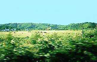 しばらくの間、左手に牧場、右手は海という構図が続く。窓を開けているため、時々牛の匂いが車内に入ってくるが気にならない。気温、湿度ともにちょうど良く爽快だ。牧場の景色を眺めていると、緑の中に点在する色つきのサイロの屋根が鮮やかに目に飛び込んできて楽しい。